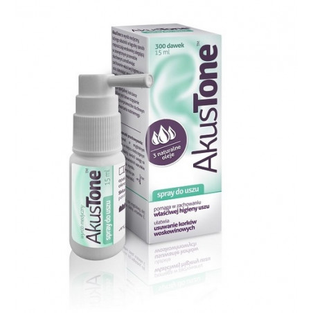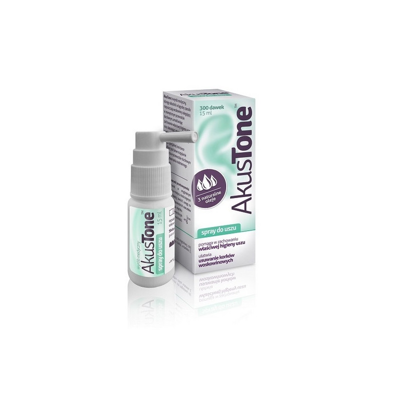 Spray Akustone to wyrób medyczny, którego składniki w łagodny sposób rozpuszczają woskowinę zalegającą w zewnętrznym przewodzie słuchowym, umożliwiając zachowanie właściwej higieny uszu oraz ułatwiając usuwanie korków woskowinowych i przeciwdziałając ich powstawaniu. Dzięki specjalnej końcówce możliwe jest łatwe rozpylenie produktu w przewodzie słuchowym bez wytwarzania nadmiernego ciśnienia. Spray rozpuszcza zalegającą woskowinę, przeciwdziała powstawaniu korków woskowinowych, umożliwia zachowanie właściwej higieny uszu w przypadku nadmiernej produkcji woskowiny u dzieci lub osób noszących aparaty słuchowe lub słuchawki, przeciwdziała zaleganiu wody w przewodzie słuchowym w trakcie kąpieli lub uprawiania sportów wodnych, u osób z tendencją do nawracających infekcji ucha zewnętrznego.