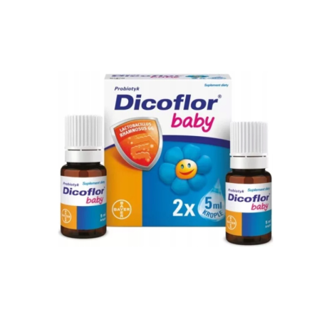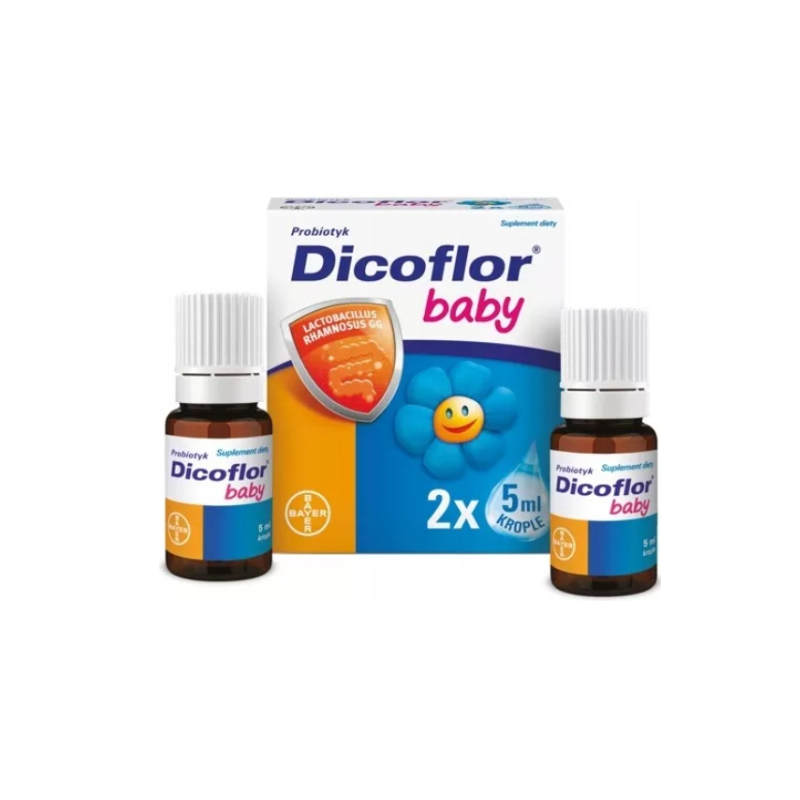 Dicoflor baby to preparat osłonowy w postaci kropli, który zawiera liofilizowane żywe kultury bakterii Lactobacillus rhamnosus GG (ATCC 53103).
