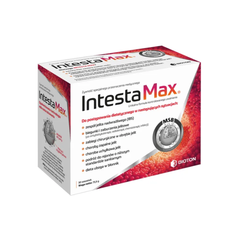 Granulat w saszetce Intesta MAX jest nierozpuszczalny w wodzie. Zaleca się bezpośrednio wsypać zawartość saszetki Intesta MAX do ust i popić wodą lub innym płynem o temperaturze pokojowej lub zmieszać z gęstym posiłkiem np. jogurtem lub serkiem.