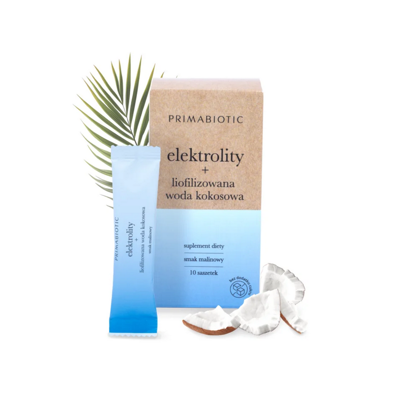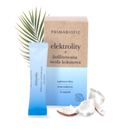Primabiotic Elektrolity + liofilizowana woda kokosowa to suplement diety w postaci proszku o smaku malinowym do przygotowania napoju funkcjonalnego. Wzbogacone o wodę kokosową Cococin®, która jest naturalnym źródłem elektrolitów.