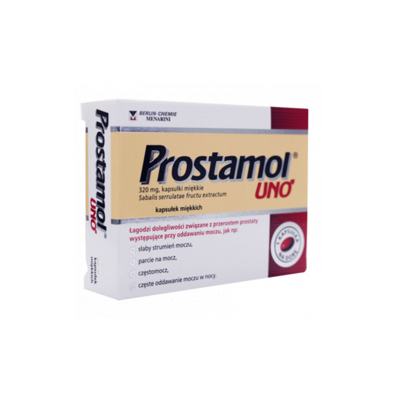 Prostamol Uno to preparat stosowany w I i II stadium przerostu gruczołu krokowego - w zaburzeniach oddawania moczu przy łagodnym przeroście gruczołu krokowego oraz w zaleganiu moczu z objawami zapalenia pęcherza. Lek łagodzi dolegliwości związane z przerostem prostaty i które występują przy oddawaniu moczu, jak np.: słaby strumień moczu, parcie na mocz, częstomocz, częste oddawanie moczu w nocy. Produkt adresowany do mężczyzn.